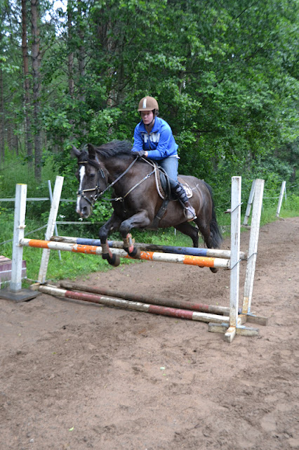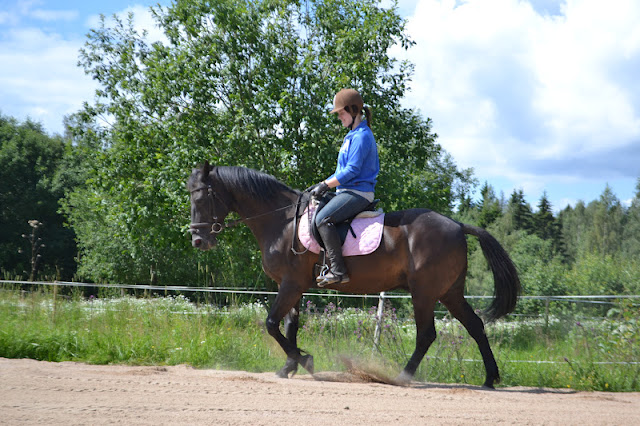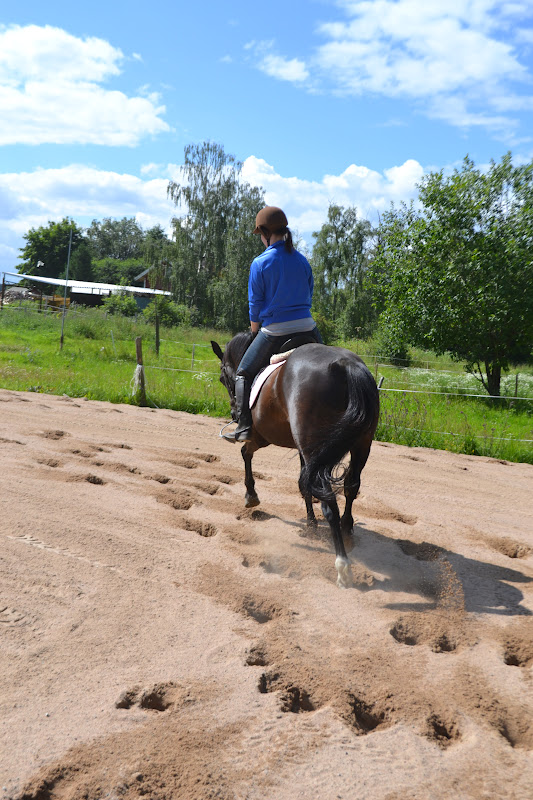 Elikkäs Matilla oli nyt kunnon tehoviikonloppu! Perjantaina menin siirtymisiä, kun Matin kanssa ongelmana on ollut se, että aina käyntiin siirtyessä kiskastaan ohjat ratsastajalta pois. Aika hyvin poika tajusi pian jutun idean ja siirtymiset onnistu huippuhyvin! En ole kyllä itsekkää siellä selässä vaan matkustellut, vaan mennyt harjoitusravia ja koittanut hioa niitä omia ongelmia. Koulukisoihin syksyllä ehkä ollaan menossa, joten seuraavat asiat täytyisi saada kuntoon; ryhti,katse ja kädet. Jotenki aina oon siellä selässä kyttyrässä ja tsiigailen muurahaisia(sunnuntaina sieltä kyllä löytyi etanoita). Ja kädet mulla on aina sylissä tai sitten jossain metrin kaukana toisistaan.