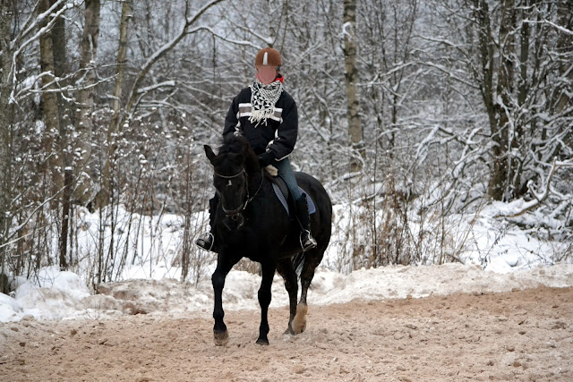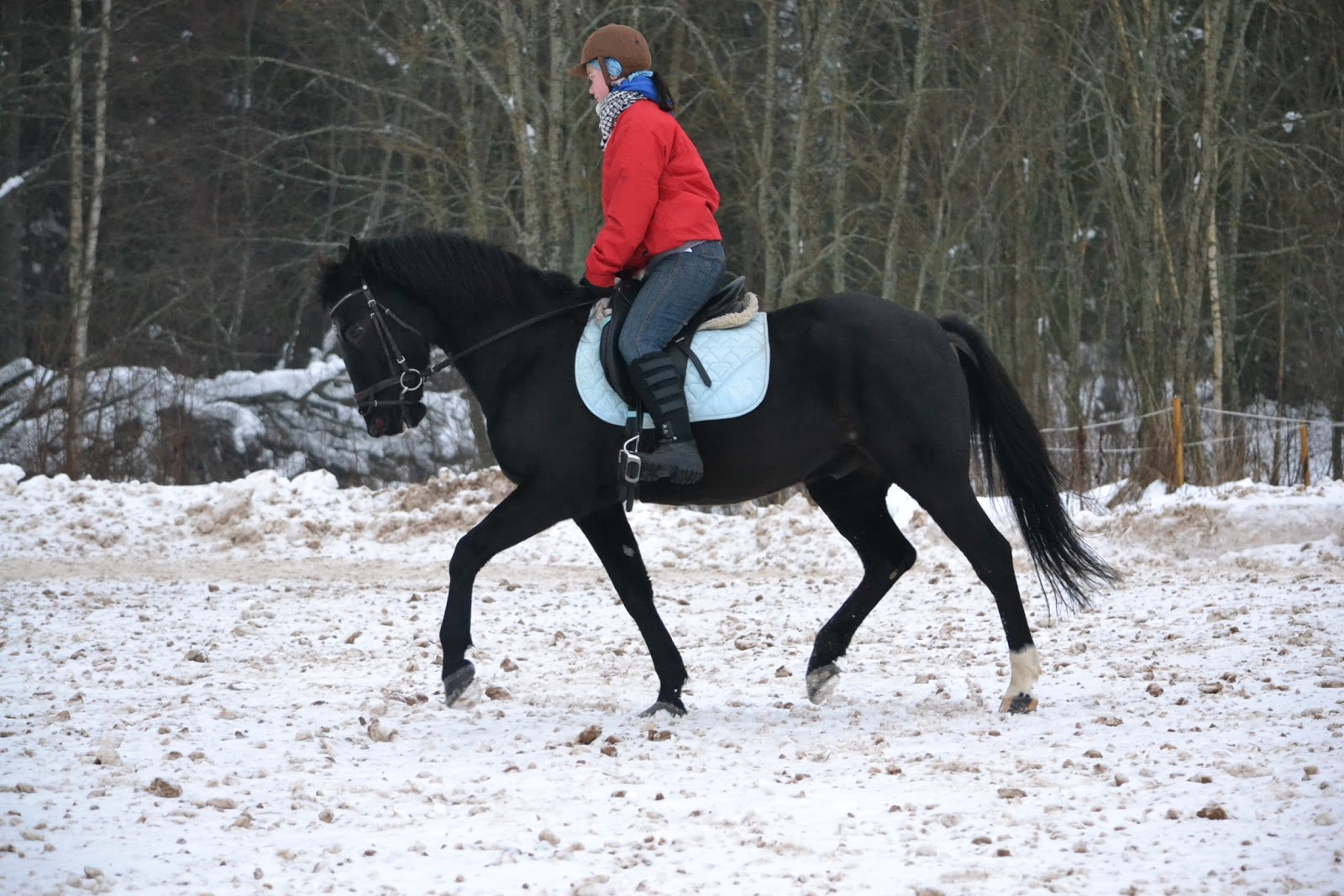 Aluksi ehtävänä oli ainoastaan tehdä käynnistä pysähdyksiä, jotka sujuivatkin ihan suhteellisen hyvin. Seuraavaksi lähdettiin ravaamaan ja tekemään käyntiin siirtymisiä. Minulla meni hermot siihen, kun Matti juoksi alta pois koko ajan ja tuntui ettei mikään pidäte mennyt läpi. Mun on yksinkertaisesti pakko oppia olla menettämättä hermojani, sillä se ei todellakaan auta asiaa yhtään. Alkoi kuitenkin Matin kanssa se hyppeleminen ja se veti yhdessä vaiheessa hermottoman loikan! Hyppy tuli ihan yllättäen mulle, mutta se ei todellakaan ollut mikään, mistä olisi lentänyt alas. Pienten alkuvaikeuksien jälkeen alkoi homma luistaan. Yritin pitää kroppani rentona ja kädes tasaisena. Aloitettiin tehtävä, jossa mentiin rata poikkisuuntaan leikkaa ja lävistäjän keskellä pydähtyminen. Tämä tehtävä oli mieluinen ja Matti toimi siinä todella hyvin, että siinä vaiheessa nautin taas ratsastamisesta. Matti haki välissä jopa oikeanlaiseen muotoon. Loppuraveissa haettiin rentoa ravia, että Mattikin vähän venyttelisi. Onha se vaikeaa välillä saada ex-ravuri ravaan rauhallisesti pitkillä ohjilla, mutta kyllä se loppujen lopuksi onnistui aika hyvin. Oon innoissani siitä, että olen oppinut todella paljon uutta valmennuksien ansiosta ja toivon, että kohta loksahtais palaset kohdalleen Matin kanssa!