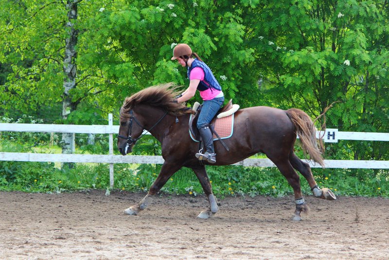 Miinuksena olen huomannut, että olen lievästi etukenossa ja kun ratsastaessa tajusin asian, sekä korjasin sen, alkoi sujumaan paremmin. Välillä kuitenkin tajusin olevani taas etukenossa. Onneksi valmennuksissa siitä sanotaan koko ajan, niin eiköhän se kohta sinne takaraivoon mene.