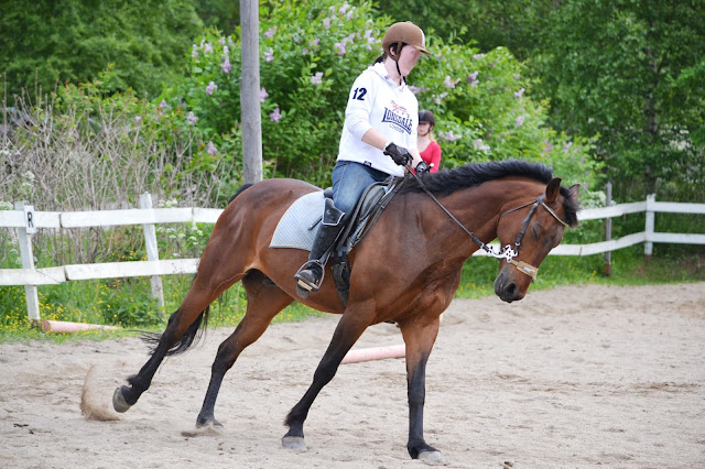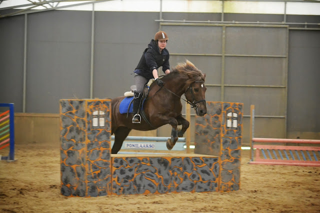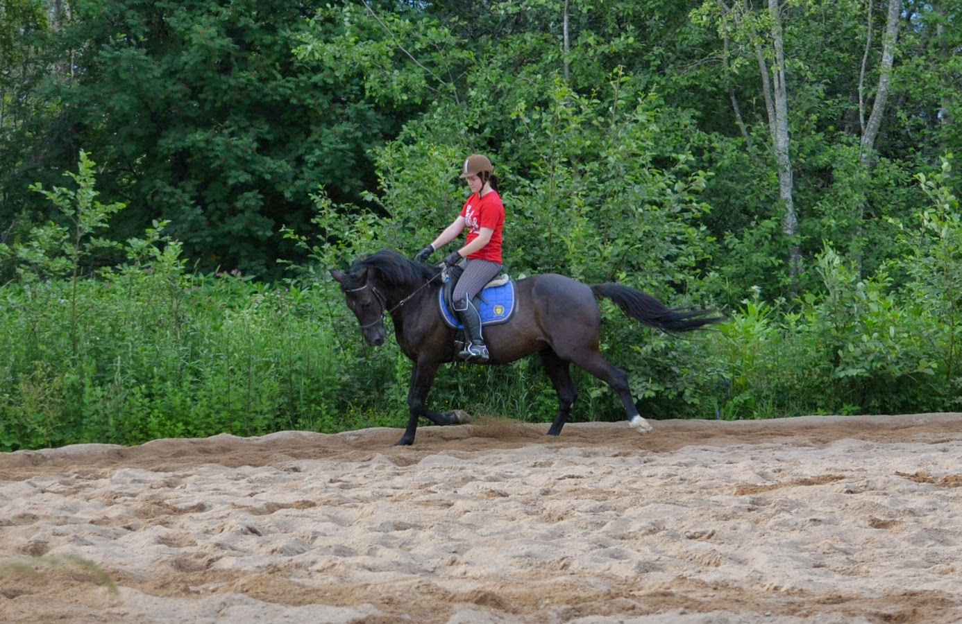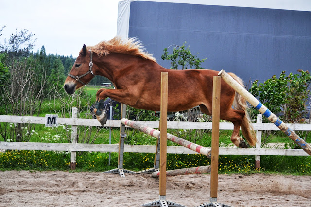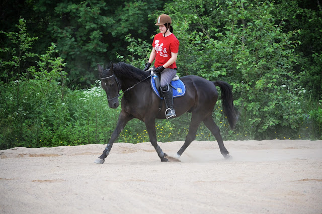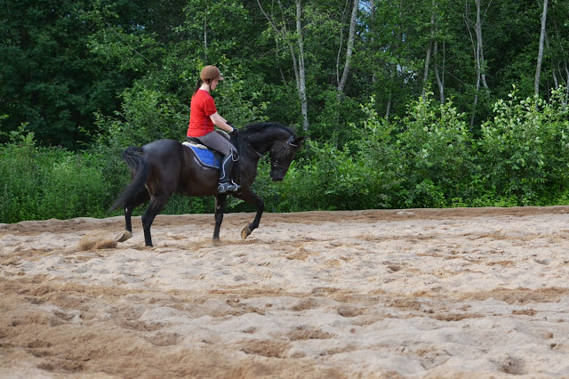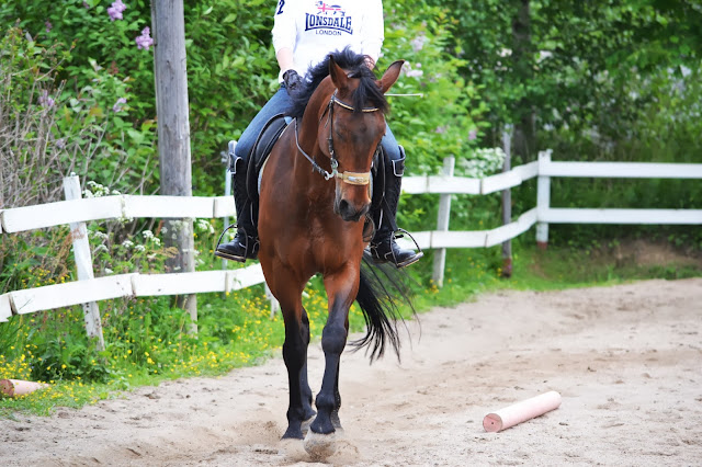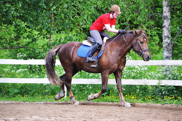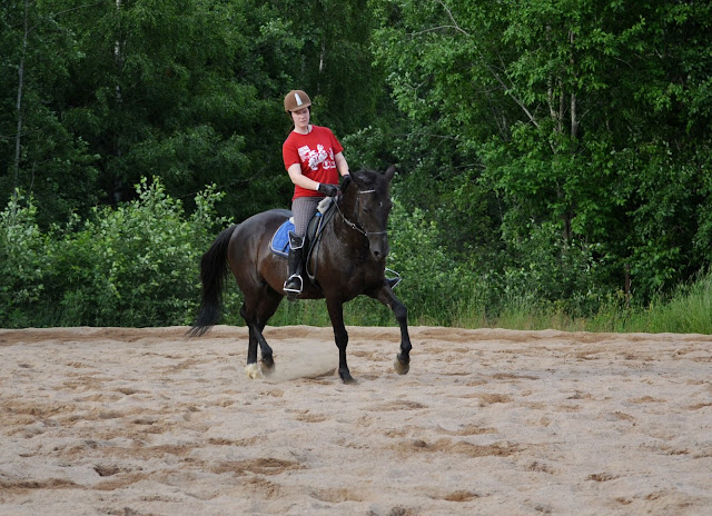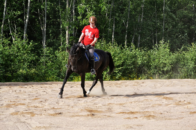 Tänään laukkailtiin myös pitkästä aikaa uralla ja Masalle se on ollut vaikeaa, kun tottunut liikaa laukkaamaan ympyrällä. Tehtävässä siis tehtiin 10m voltti pitkälle sivulle, voltin jälkeen laukan nosto ja lyhyen sivun keskellä ravin kautta käyntiin. Matti nosti yllättävän hyvin laukan, mutta välillä takajalat eivät olleet mukana laukassa. Mikä parasta kuitenkin, me ei keulittu. Tietty Matti alko käymään kuumana ja välillä jouduttiin tekemään muutama voltti extraa, jotta oltais näytetty edes siedettävältä. Vasempaan suuntaan nostot onnistuivat paremmin kuin oikeaan, mutta oikeassa kierroksessa laukka oli tosi rytmikästä ja rauhallista.